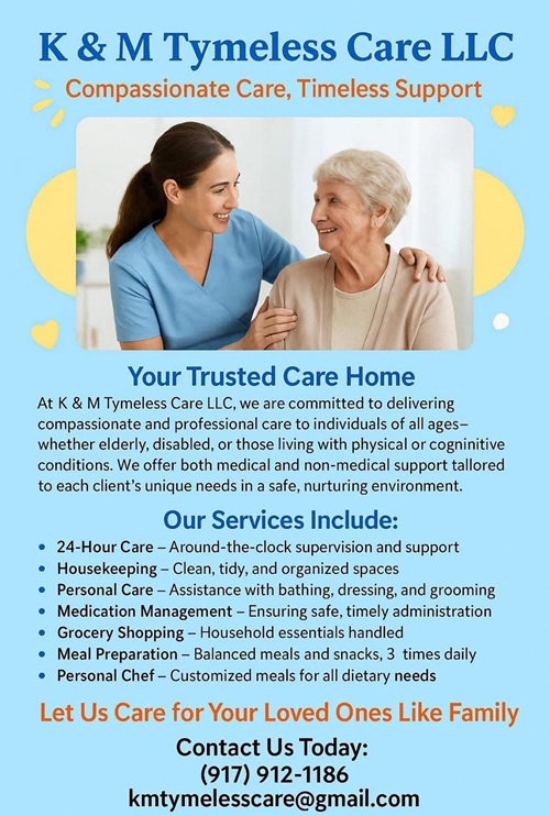 K & M Tymeless Care LLC is a private care home that Provides (medical / non-medical ) care services to (elderly, disabled and people of all ages physical conditions and cognitive abilities), yet requires assistance with certain daily or weekly activities. Working closely with clients and their families.